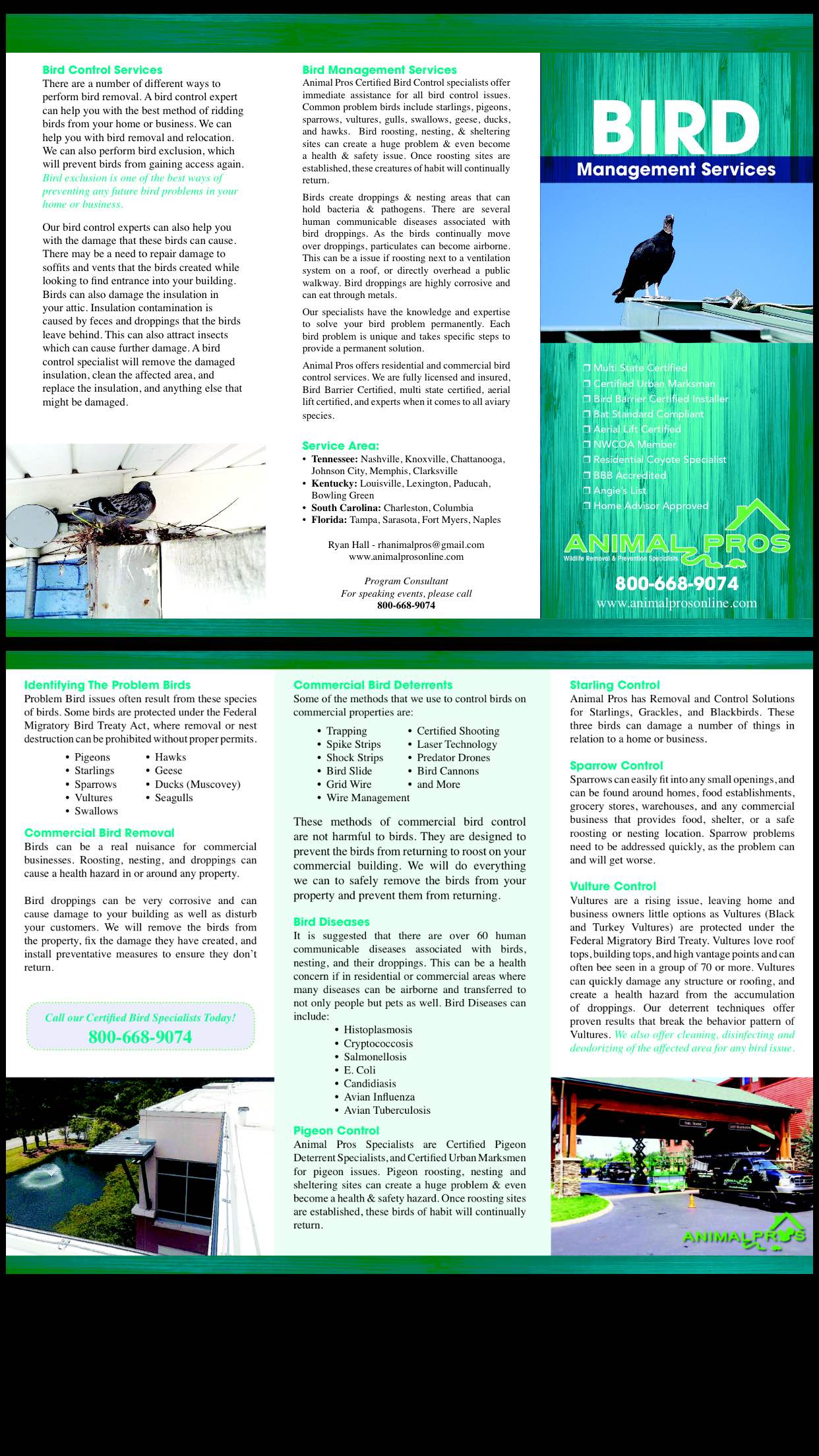 Animal Pros offers residential and commercial bird control services for homeowners, businesses, property managers, airports, and government. We are fully licensed and insured, Bird Barrier Certified, multi state certified, aerial lift certified, and experts when it comes to all aviary species.